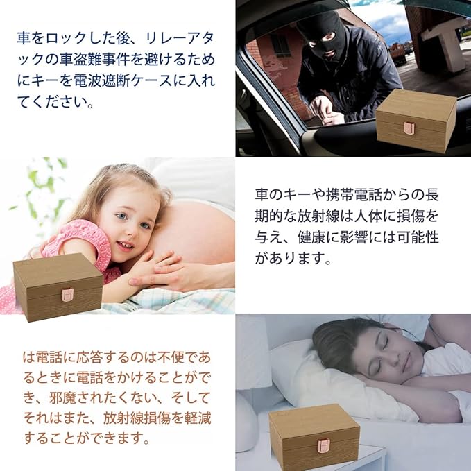 【リレーアタック防止ケース】リレーアタック原理:電波増幅器を利用して、スマートキーから出る微弱な電波を増幅し、車のドアロックを簡単に解くことができ、エンジンをかけて車を盗むことができます。弊社の電波遮断ボックスはスマートキー専用の電波遮断ケースなので、ボックスに入れるとキーの電波中継を完全に遮り止めることができて、お手元のスマートキーを狙ったリレーアタック(車盗難手口)を無効化になる可能です、それで車盗難を防ぎます。JXE JXOの電波遮断ボックスは、最多三つのスマートキーを入れられます。注意事項:箱のふたを完全に閉じないと電波の遮断ができないので、使用の際は注意が必要です。