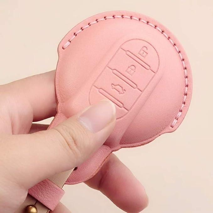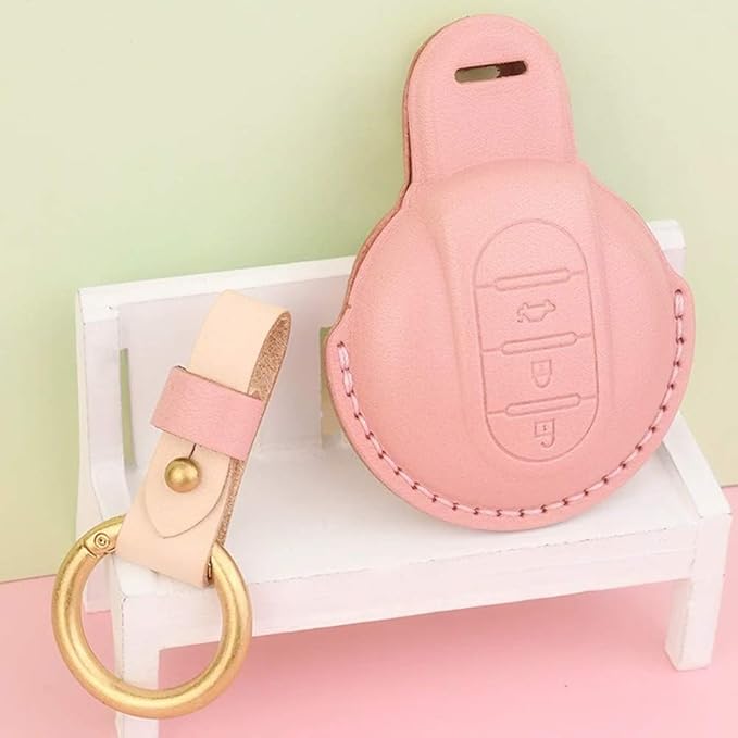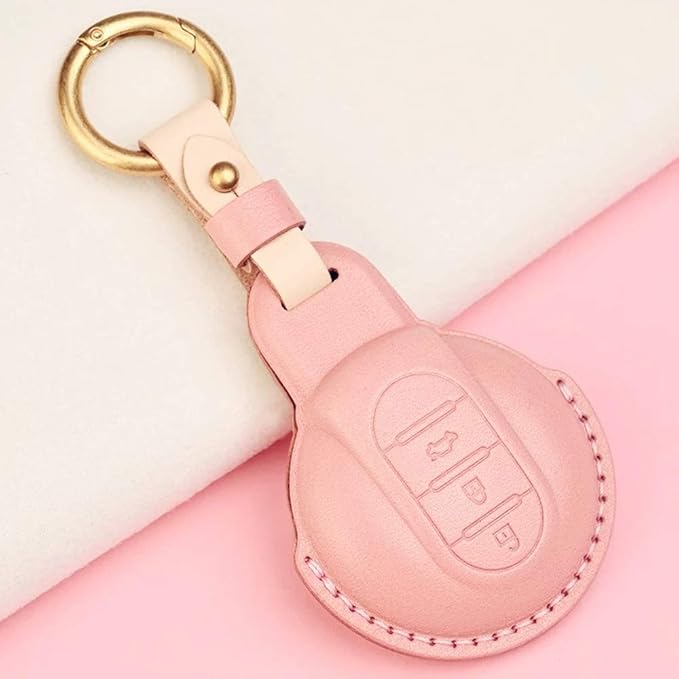 ミニクーパー MI-NI キー カバー ケースクロスオーバー(MI-NI crossover) F60 MI-NIクラブマン(MI-NI Clubman) F54 F55 F56 F57牛革素材スマート キー ケース キーカバー キーホルダー (ピンク)