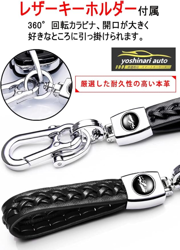 【高級感】:上質なレザーで豪華さを演出してくれます。本キーケースを取り付けるだけで愛車のスマートキーはまるで高級車のキーに様変わりします。何気なくスマートキーを出すだけで周りの注目を集めます。愛車自慢のあなたにお勧めの逸品です。