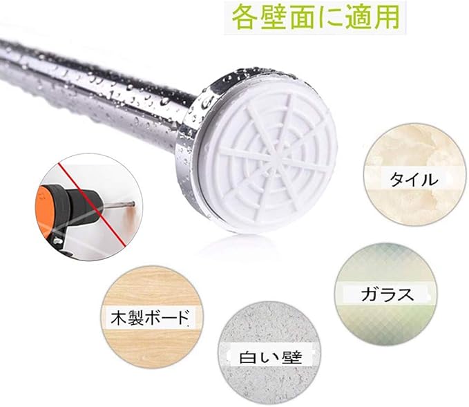 【色んな場所で大活躍】伸縮棒はタイルの壁面だけではなく、木製壁などの表面にも使用できます。湿気の多い梅雨季節でも普通の時でも、シャワーカーテンロッド、バスルーム衣類用ロッド、室内クロゼットロッド、カーテンロッド、DIY棚、布団干し、屋外物干しなど様々なシーンで活用できます。
