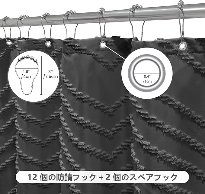 防錆金属フック:頑丈な電気めっき処理金属フックを採用し、プラスチック製に比べ優れた耐久性を発揮。このトレンディなシャワーカーテンには14個のフックが付属しており、12個のグロメットより2個多いため、迅速な交換が可能で、長期にわたる利便性と使用を保証します。
