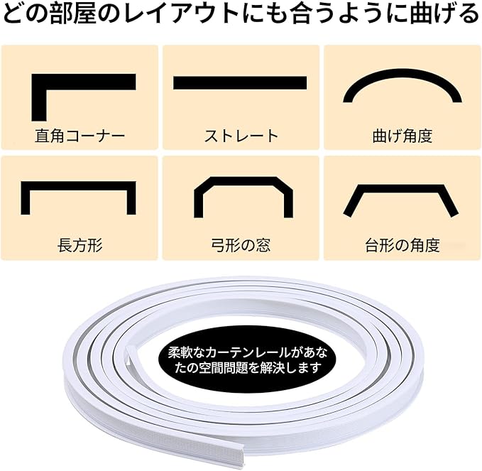 【設置場所】出窓、直線、円形、曲線コーナー、アーチ窓などあらゆる場所に使用できる汎用カーテンレールになります。柔らかいカーテンレールと違い、適度な硬さがあるのでしっかりと取り付けることができます。