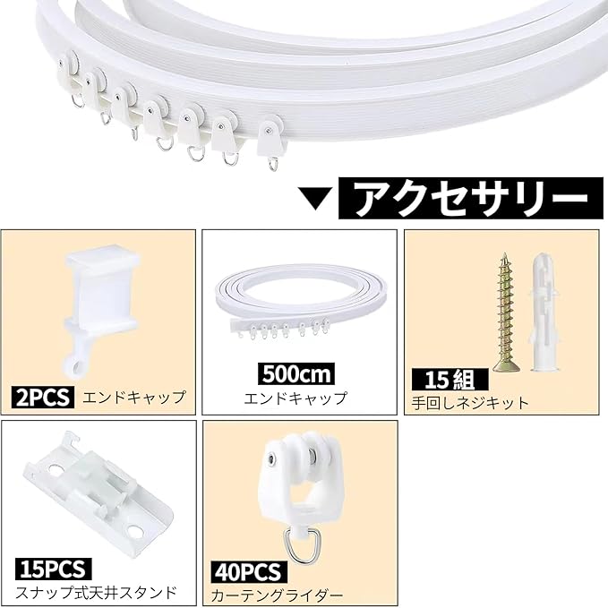 【注文内容】レール本体5M*1本、ランナー40個・取付金具15個・エンドキャップ2個・釘とカバー15個。現場の形状に合わせて自由なカーブ加工が可能!窓に合わせて長さ調節可能です。