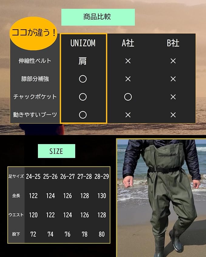 [unizom] ウェーダー 釣り 胴長 長靴 【ヒザ補強・簡単脱着・伸縮ベルト】 ラジアルソール 完全防水 丈夫 チェストハイ フィッシングウェーダー