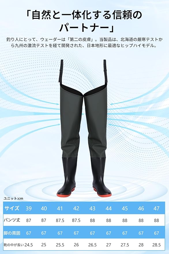 軽量設計で快適な釣り体験:特殊素材を使用した軽量ヒップウェーダーは、長時間の釣りでも快適に過ごせます。負担を感じさせないフィット感で、釣りに集中できます。