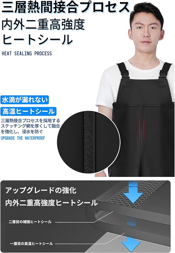 高機能素材:このウェーダーは、PVC素材を採用し、内側には通気性のある編み地を使用しています。防水性、透湿性に優れるだけでなく、耐水性、防油性、耐酸アルカリ性も備えています。
