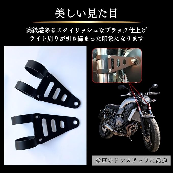 【フロントフォーク41〜43mm対応】フロントフォーク径41〜43mmに取り付け可能な汎用ヘッドライトステー。2個セット&取付金具付きで、ボルトオン装着可能! 掘削不要で初心者でも簡単に取り付けられます。汎用品のため、サイズが合えばどの車種にも増設できます。大切なオートバイ・原付のカスタムパーツにご利用下さい。