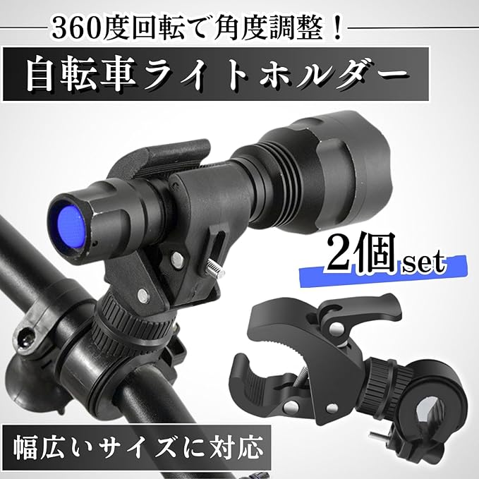 CHASO 自転車 ライトホルダー 2個セット 懐中電灯 クランプ 360度回転 ブラケット チャリ ライトステー サイクル ハンドル マウント ブラック
