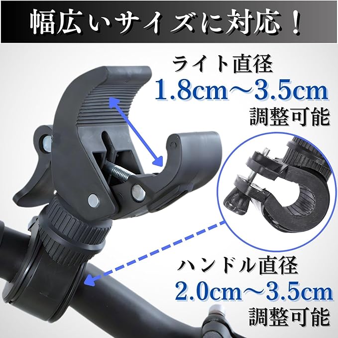 対応するライトの直径は約1.8cm~3.5cm、ハンドル直径は約2.0cm~3.5cm。本体サイズは縦11cm 横5cm。セット内容:自転車ライトホルダー2個セット。ブラックのシンプルなデザインで、ライトブラケットとしても活用できる便利なアイテムです。