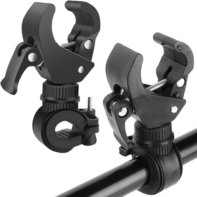 自転車ライトホルダー2個セットは、懐中電灯やヘッドライトをしっかり固定できるブラケットです。360度回転するクランプ式で、ライトの向きを自由に調整可能。滑り止めラバーとゴムスペーサー付きで、走行中の振動でもズレにくい設計です。ブラックのシンプルなデザインで、ハンドルバーやフロントフォークに装着できるライトマウント。サイクル用のライトステーとしても最適です。