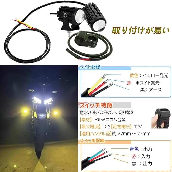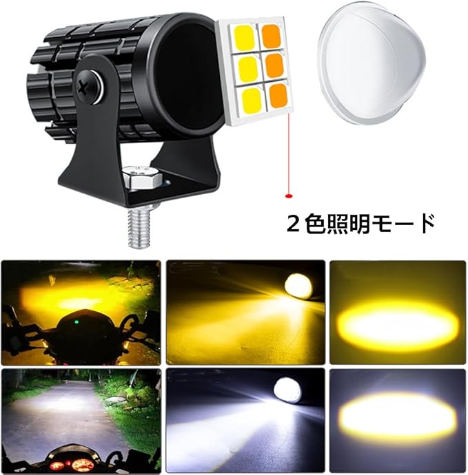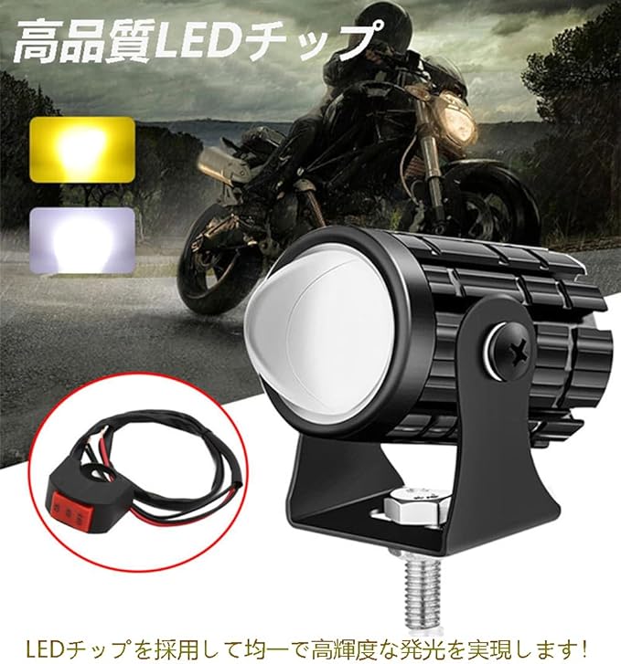 YFFSFDC バイク フォグランプ LED 2色切り替え ホワイト イエロー 常時点灯 補助灯 車外灯 小型 前照灯 高輝度 防水 汎用 スイッチ付き 2個セット