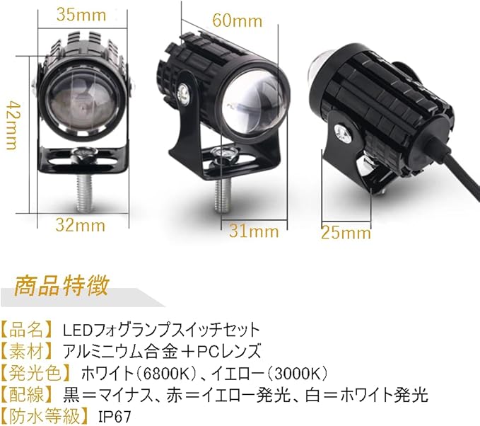 1. フォグランプ2個セット、スイッチ1個セット。ライトは、ホワイト(6800K)、イエロー(3000K)のデュアル仕様。