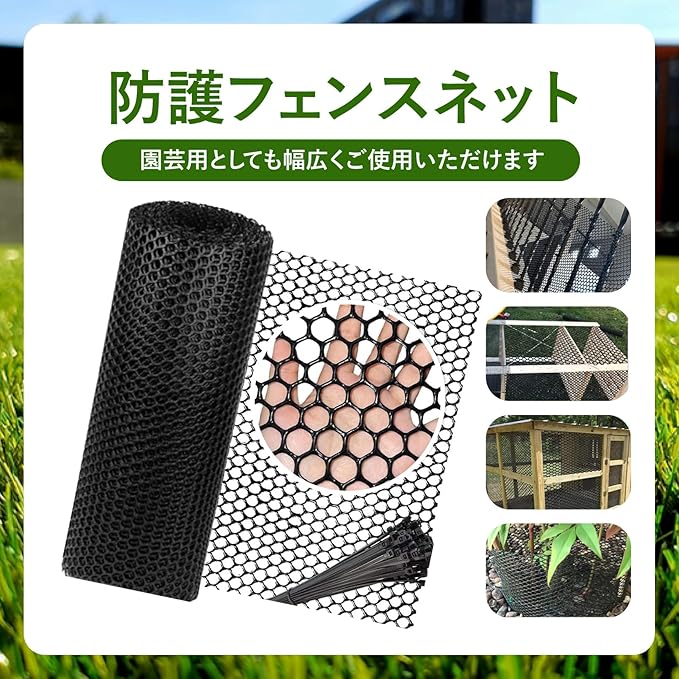 【商品詳細】セット内容:メッシュシート、結束バンド20本以上(長さにより異なります) カラー:ブラック サイズ:幅40cm 長さ3m/5m/10m 孔径:約0.8cm 材質:ポリエチレン