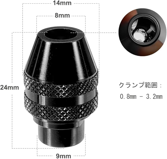 【ドリルチャック】チャック部軸径範囲:0.8~3.2mm、最高対応回転数:35,000 min-1(回/分)、パッケージ:3本*ミニドリルチャック。ドリルビット、研磨ビット、研磨ホイール、鋼線、ワイヤブラシ、切削ホイールなどの軽部品に適しています。