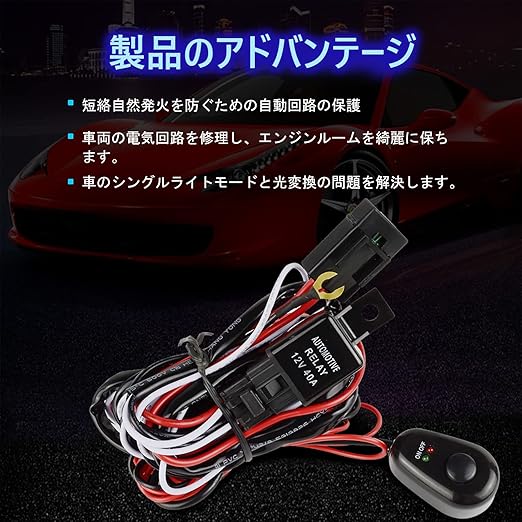 Safego 汎用フォグランプ配線 作業灯配線キット 汎用スイッチ付き リレーハーネス フォグランプリレー LEDグリル取付用配線キット ワイヤーハーネス 表示LED搭載 スイッチ付 12V/ 40A 最大130wまでサポート 【2灯用】