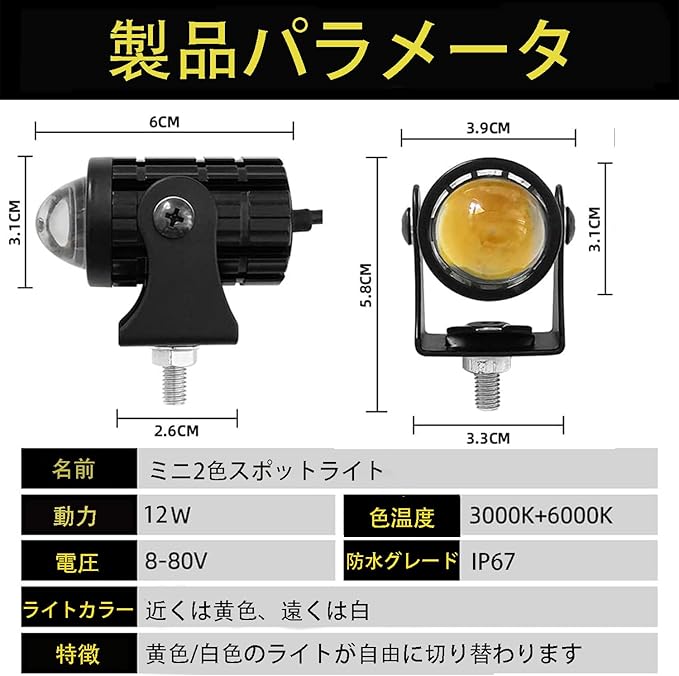 Roczential 2 個セット バイク フォグランプ LED 8-80V 2色切り替え ホワイト イエロー 常時点灯 補助灯 車外灯 前照灯 高輝度 防水 耐衝撃 機械照明などに汎用