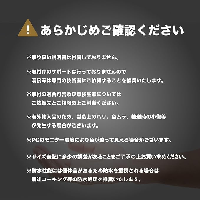 【5. ご購入前のご案内と注意事項】・本製品は輸入品のため、使用に支障のない程度の箱の潰れや傷や擦れがある場合がございます。あらかじめご了承ください。 ・取扱説明書は付属しておりません。また、取り付けに関するサポートは行っておりません。取り付けに不安のある方は、専門業者へご相談ください。 ・ご使用方法や取り付けによって発生したトラブル・事故等に関しては、一切の責任を負いかねます。お客様ご自身の責任においてご使用ください。 ・完全防水ではないため、必要に応じて追加の防水処理を施すことを推奨いたします。