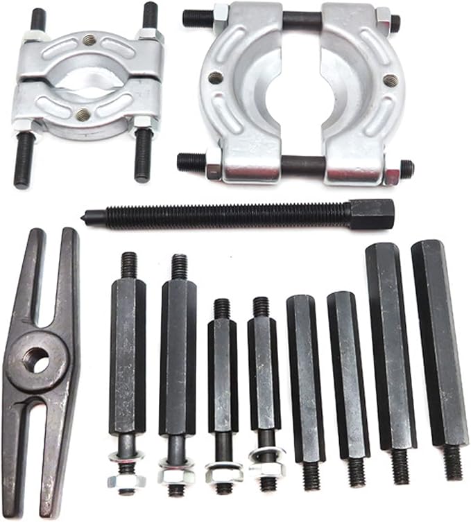 【幅広い用途】車、オートバイ整備工具、ベアリングやギアの抜き取りの際に使用します。すき間のないベアリングやギヤなどの引き抜きに最適です。ダブルベアリングや、密着したギヤの間に挟み込んで使うことができます。軸からベアリングを取り外したり、ベアリングを分割したり、フライホイールを分離したりできます。