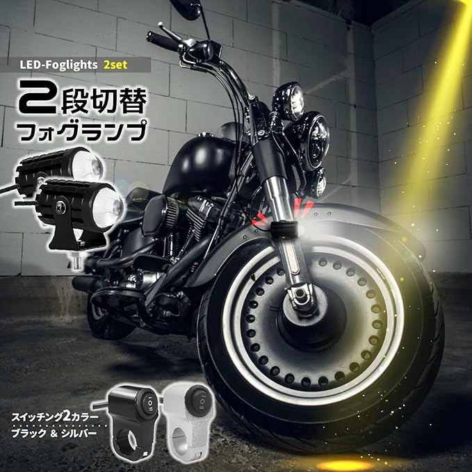 フォグランプ2個セット、スイッチ1個セットは、バイクのカスタムに最適。選べるハイ&ローの2色切り替え式のLEDライト、スイッチをセットに。汎用性が高く色々なバイクに設置可能、専用ビス付きで簡単ドレスアップ、DIYに。