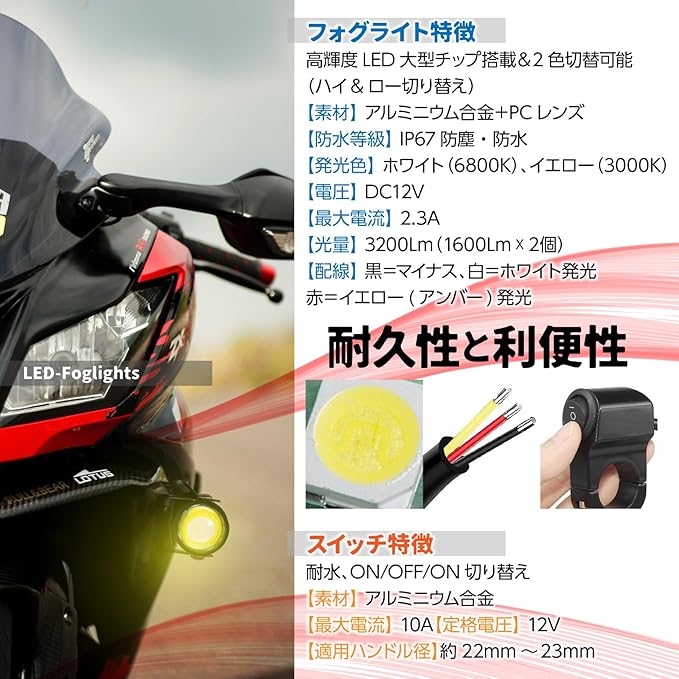 【品名】LEDフォグランプスイッチセット(ライト本体2個、スイッチ1個)【ライト特徴】HI-LOW(ハイロー切り替え)【素材】アルミニウム合金+PCレンズ【発光色】:ホワイト(6800K)、イエロー(3000K)【電圧】12V【最大電流】2.3A(1個)【消費電力】12W(1個)【光量】3200Lm(1600Lm 2個)【光源】LED【配線】黒=マイナス、赤=イエロー(アンバー)発光、白=ホワイト発光 【防水等級】IP67【カラー】ブラック【スイッチ特徴】耐水、ON/OFF/ON切り替え【素材】アルミニウム合金【最大電流】10A【定格電圧】12V【適用ハンドル径】約7 / 8インチ 22mm~23mm【カラー】ブラック、シルバー※モニターの環境により、色の見え方に若干差が生じる場合がございます。
