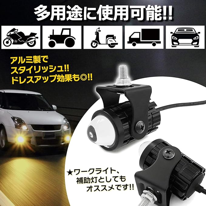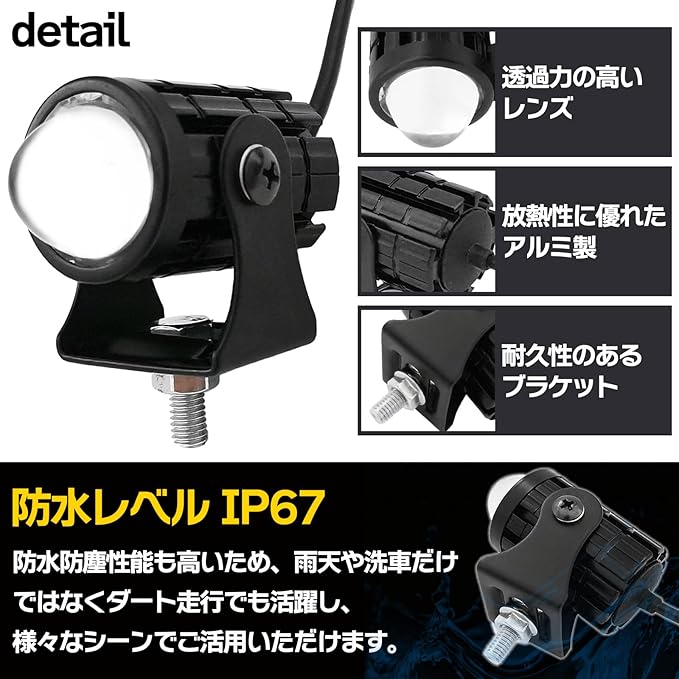 IP67防水で防塵性能も高いため、雨天や洗車だけではなくダート走行でも活躍します。 一般的なバイク、オートバイ、スクーター、原付などのドライブでの使用はもちろんATVやレーサー仕様や、フォグランプ、スポットライト、ワークライト、補助灯(照明)としてもオススメです。