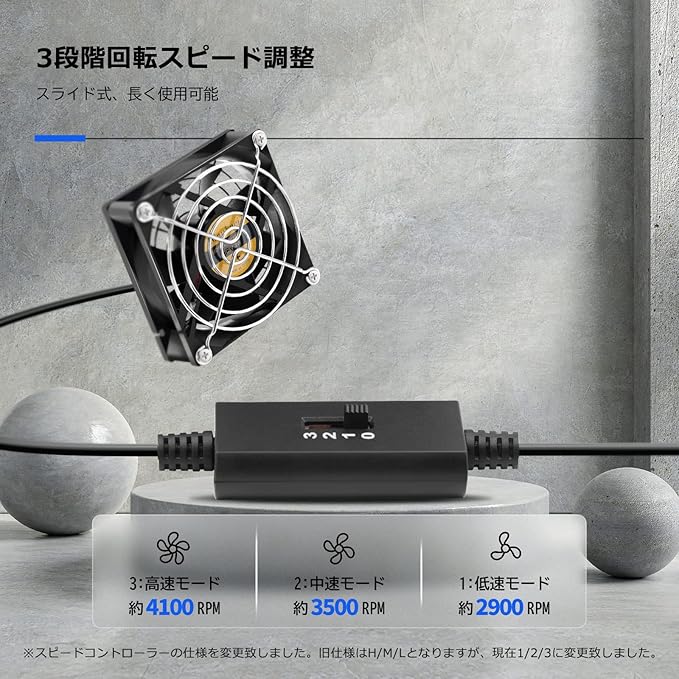 スピードコントローラーが搭載され、強/中/弱三段階調整できるため、ご利用環境により、風量及び騒音の調整も可能になります。