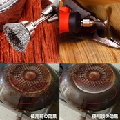 【適用範囲】鉄、銅、真鍮、木材などの表面研磨、金属のサビ落とし、よごれ落とし、塗装はがし、錆取り作業、バリ取り、変木や木の根などの仕上げ作業に適用します。形状が違うので溝など狭い部分の作業に可能です。