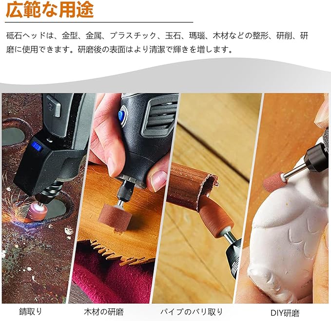 ロータリー工具:ミニルーター/ 電動ドリル/電動ドライバー。軸付砥石の軸径:3mm、許容回転数:5000rpm。注意:許容回転数を超える回転数では、絶対に使用しないでください。