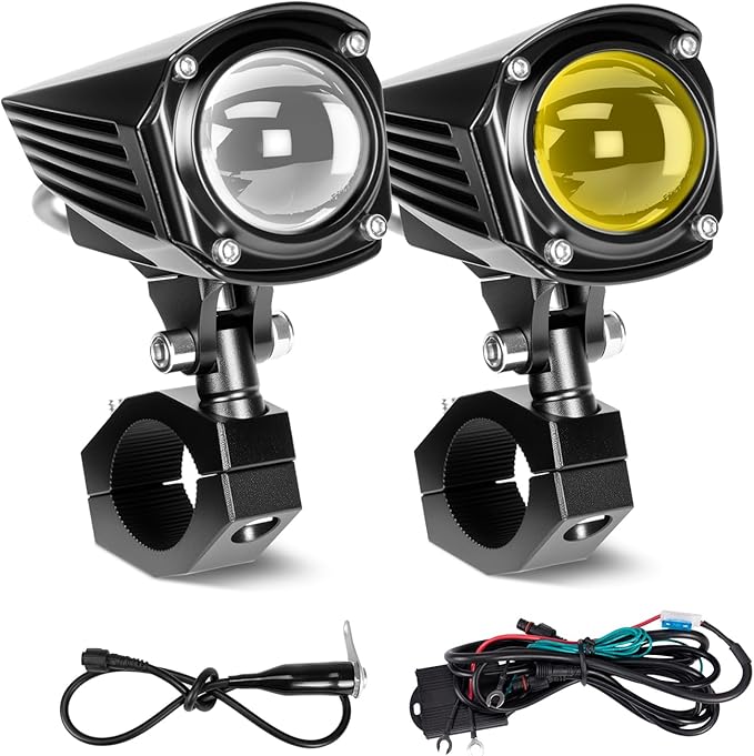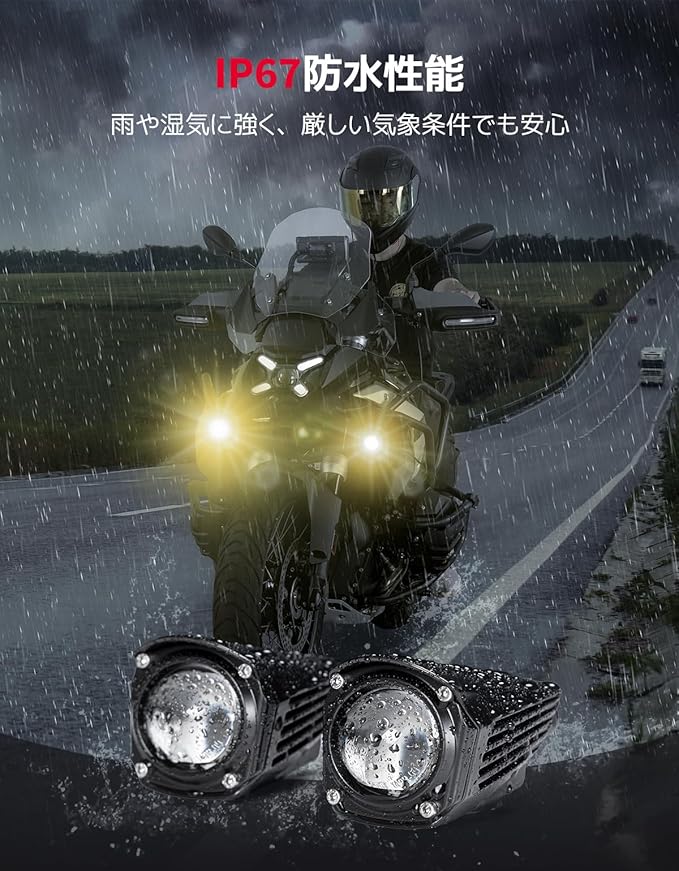 【クリアな視界・安全な走行】高品質60WLEDチップを搭載し、6000ルーメンの明るさを実現したバイクフォグランプです。優れた明るさとクリアさを提供するだけでなく、光学ガラスレンズが光の集光と投影を強化します。暗闇、霧、雨でもこれで安心!