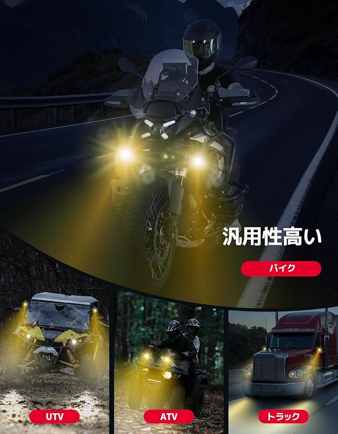 【取付簡単・汎用性高い】バイクフォグランプは、ほとんどのバー径((19-30mm))に対応でき、バイク、スクーター、自転車、ATV、UTVなど多様な車種に適用可能です。