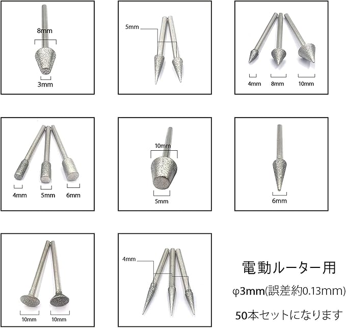 素材 :合金、ダイヤモンド;シャンク径(各) : 3mm(誤差約0.13mm)