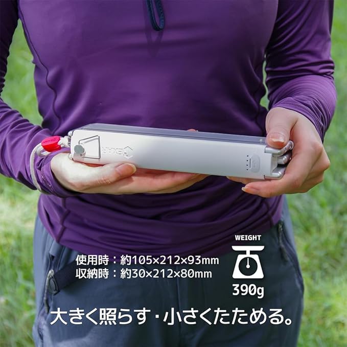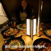 1.美しく輝く3枚、6面配光は大光量でも優しい光で場を満たします。もちろん無段階調光・電球色。 2.おりたたんでコンパクト、その携帯性でファミリーキャンプからキャンプツーリングまで幅広く対応。 3.機能・デザイン・マテリアルを再定義、使い勝手に優れたシンプルなフォルムは様々な空間と調和。