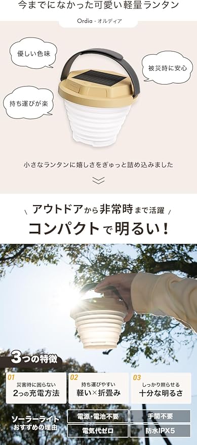 もしもの備えにも!コンパクト&高性能なソーラーランタン「Ordia(オルディア)」。USBとソーラーの2つの方法で充電が可能で、最大24時間の長時間点灯も。防水IPX5仕様で、雨の日でも安心して使用できます。明るさは3段階調光ができ点滅モードも選べで、キャンプ利用はもちろん非常時の夜間避難や非常灯にもぴったりです。折りたたみ仕様で非常に軽いので携帯性も抜群です。インテリアにも馴染むボディーカラーと優しい暖色系の光、日常的に使いやすいLEDランタンです。