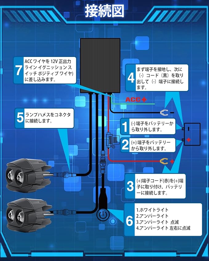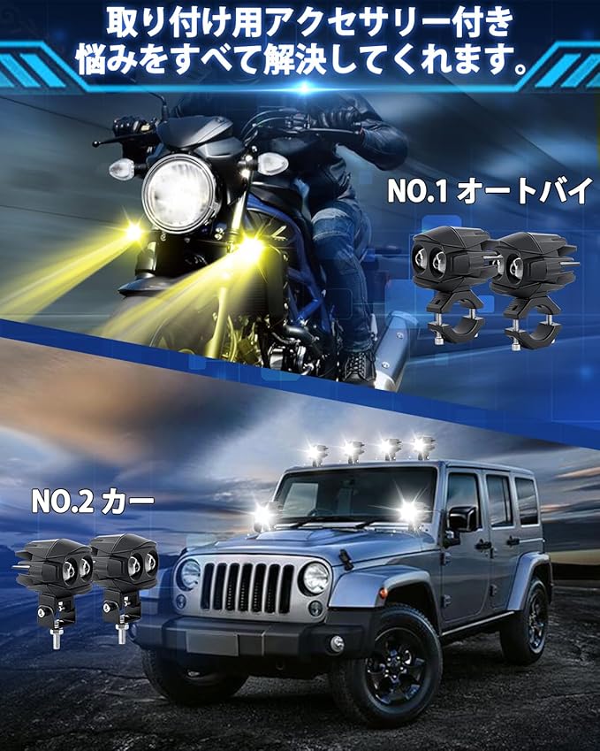 【ファインデザイン&優れた品質】フォグランプ バイクの新技術OBL-MOD(専用光学レンズ)とアップグレードされたLED 7530チップを採用し、高光束と高い集束効果を実現。車用LED作業灯の20000LMXの高ワット数で昼間でも非常に明るく、低消費電力で長寿命。細かい表面処理により光沢のある外観が作成され、高級感とエレガントな感覚が加わります。