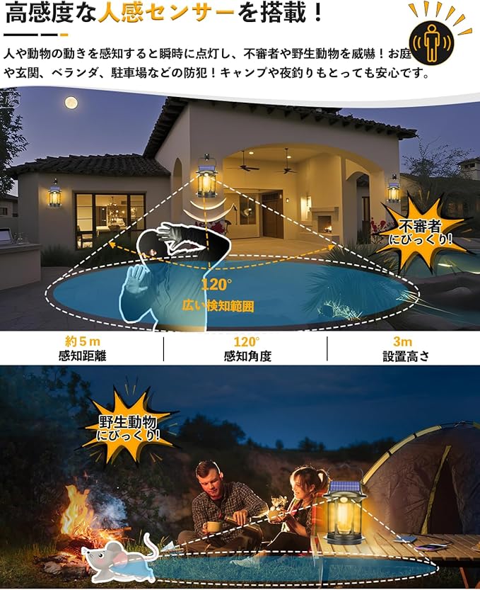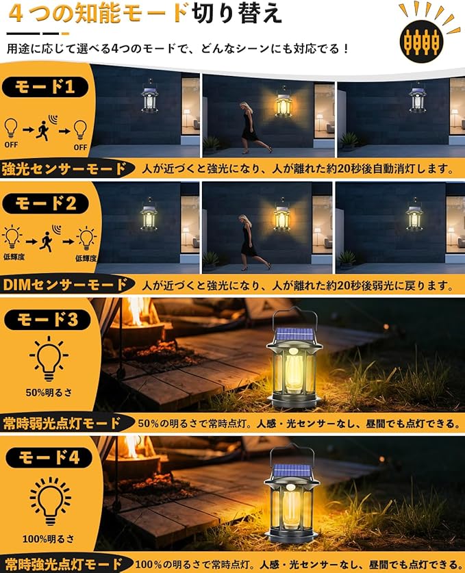【高感度な人感センサー搭載・4つの点灯モードでどんなシーンにも対応】このソーラーランタンは、高感度な人感センサーを搭載し、最大5m先・120 の広範囲をしっかり検知。更に、シーンに応じて使い分けができる4つの点灯モードを搭載。「強光センサーモード1」:暗所で人や動物を感知→自動で強光点灯→20秒後に消灯。「DIMセンサーモード2」:暗所で弱光待機→人や動物を感知で強光点灯→20秒後自動復帰。「常時弱光モード3」:50%の輝度で常時点灯。「常時強光モード4」: 100%の輝度で常時点灯。(モード3/4は、人感/光センサーなし、昼間でも点灯できる。)庭先、玄関の防犯、夜間のキャンプサイト、夜釣り、屋外・室内の照明所など、用途やシーンに応じて快適な照明が実現。
