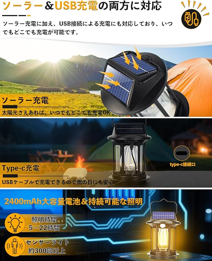 【ソーラー充電とUSB充電対応・2400mAh大容量バッテリー】ソーラー充電とUSB充電が使える充電式ランタンです。①キャンプランタンは、2枚の太陽光パネルを搭載し、日当たりの良い場所に置くだけで自動充電が可能。電気代が不要で、省エネかつ環境に優しい設計です。②曇りや雨の日でも付属のUSBケーブルで簡単に急速充電できます。充電式ledランタンとして、アウトドアでも停電時でも、電力不足の心配がありません。又、2400mAhの電池を内蔵し、1回の充電で300回以上の感知点灯又は最大5〜22時間が連続して照明可能で、頻繁な充電の手間を解消できます。