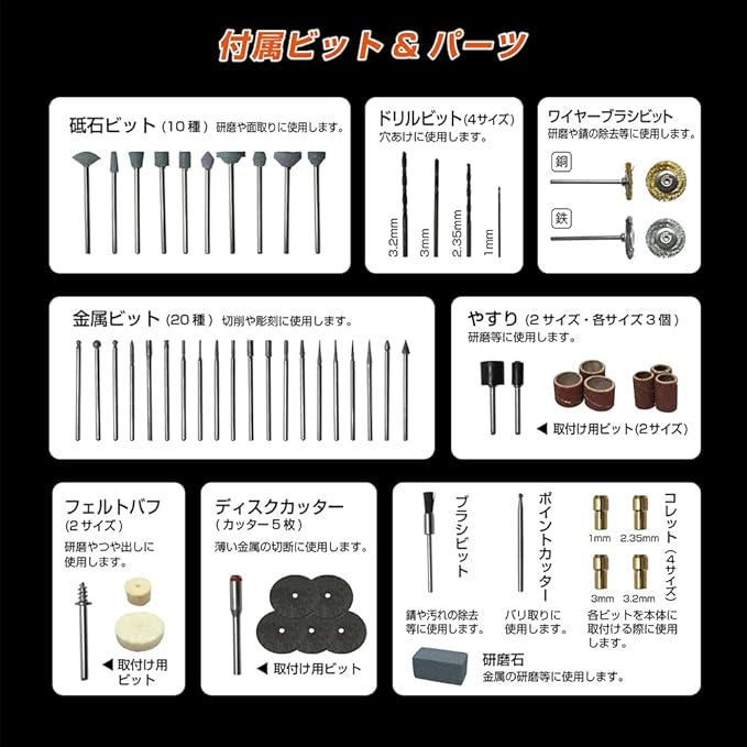 付属コンポーネント 砥石ビット (10種), 金属ビット (20種), 銅ワイヤーブラシビット, 鉄ワイヤーブラシビット, ポイントカッター, ブラシビット, やすり取付け用ビット (2サイズ), フェルトバフ取付け用ビット, ディスクカッター取付け用ビット, ドリルビット (4サイズ), やすり (2サイズ・各サイズ3個), フェルトバフ (2サイズ), ディスクカッター (5枚), 研磨石, コレット (4サイズ)砥石ビット (10種), 金属ビット (20種), 銅ワイヤーブラシビット, 鉄ワイヤーブ… 表示を増やす