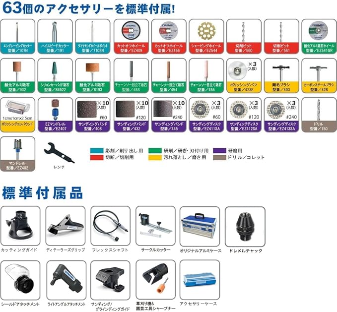 ●標準付属:オリジナル アルミケース(非売品)、ライトアングルアタッチメント(575)、多目的カッティングガイド(565)、ディテイラーズグリップ(A577)、フレックスシャフト(225AJ)、サークルカッター(678)、サンディング/グラインディングガイド(A576)、草刈機&園芸工具シャープナー(675)、シールドアタッチメントキット(A550)