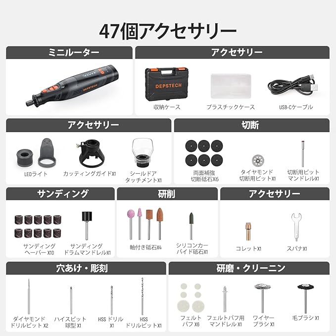 【46種類アクセサリー&頑丈なケース】DEPSTECH A1L電動リューターキットには、47個のアクセサリーが付属しており、さまざまな深さでの切断や穴あけに役立ちます。特にカッティングガイドは安定性に優れており、犬の爪研磨や木材の研磨・彫刻、アートワークの磨きなど、さまざまなホームプロジェクトやクラフト作業に活用できます。また、A1Lリューター ビットは他のブランドのアクセサリーとも互換性があります。アクセサリーのより便利な収納のための頑丈なケースで、耐衝撃性、防湿性、携帯性があります。