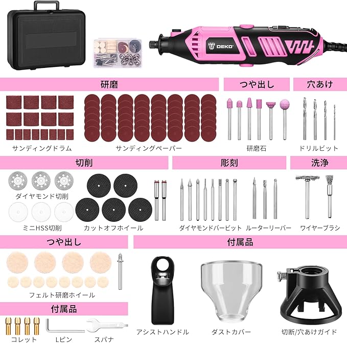 DEKOPROミニルーター 6段変速可能 127点組 付属品 8000~35000RPM回転/分 電動 ミニリューター 穴あけ/彫刻/切断/切削/つや出し/マニキュア/研磨/汚れ落とし