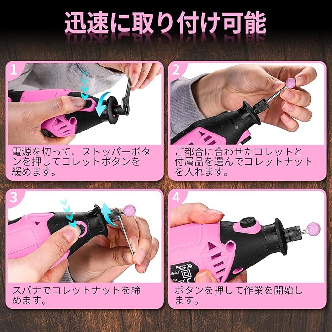 【127点組付属品付き】電動ルーターは127点組の付属品が付いてるので、彫刻/穴あけ/研磨/切断/切削/つや出し/マニキュア/汚れ落としなどの作業はラクにやることができます。