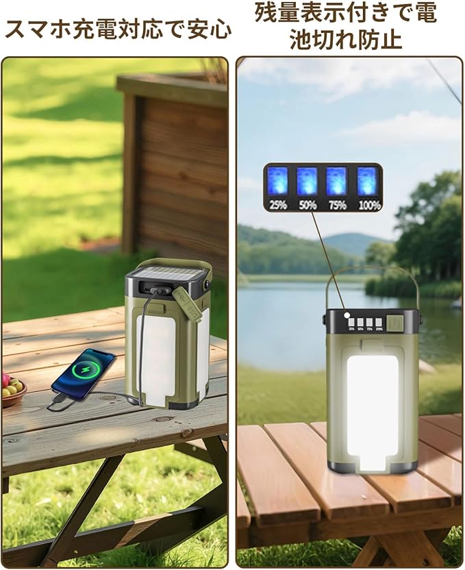【ソーラー充電式 & USB Type-C】日中は太陽光で蓄電、夜はType-Cで素早く充電できる充電式ランタン。屋外でも室内でも使いやすく、停電対策や防災用途にも安心です。