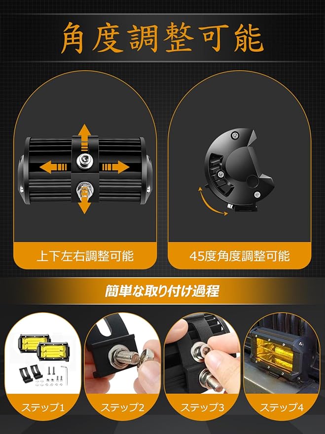 取り付け&包装:上下角度調整可能な取付ステー付き。4個セットでお得!屋外や現場作業に便利な角度調整機能!