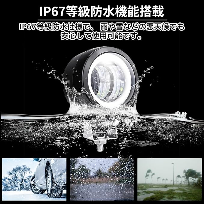 【IP68防水仕様】 丸型 フォグランプは、IP68の防水・防塵性能を誇り、雨の中でも問題なくご使用してご使用いただけます。雨水やホコリの侵入をシャットアウトし、常にクリアな視界を確保。悪天候時でもスムーズな走行をサポートします。