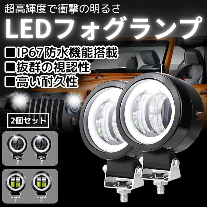 azumafy LED フォグランプ バイク 丸型 イカリング 作業灯 ワークライト オートバイ 2個セット 黄 白 補助灯 汎用 防水 防塵 12V 24V (ホワイト)