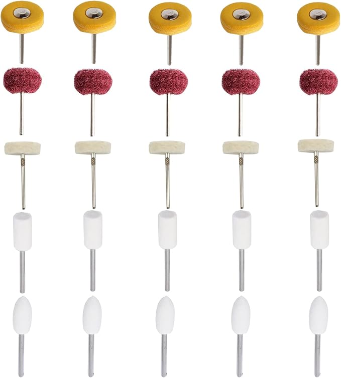 【高品質線材】:ミニルーター用先端パーツ 素材:純毛(フェルト),布,繊維 耐久性と実用 小さな、良好な研磨効果、高効率、低コスト 梱包:布バフ5本&繊維バフ5本&フェルトバフホイール型5本,円筒型5本,砲弾型5本 コレットチャック径:直径約2.35mm