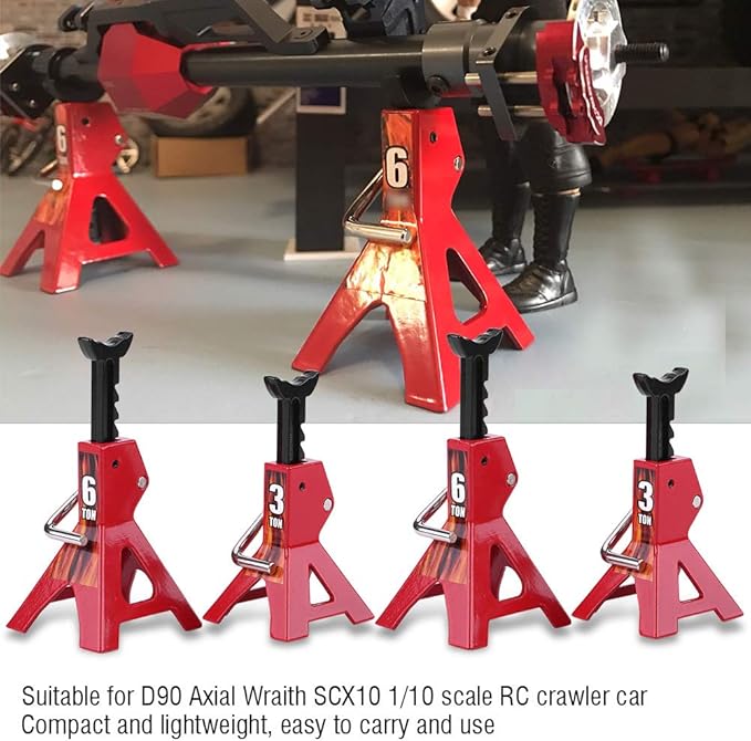 【頑丈で耐久性のある金属素材】: RC ジャックスタンドは金属製で、軽くて丈夫なので、これらの重いジャッキブラケットは RC ガレージや自動車修理店、RC メタルジャックに理想的な選択肢です。
