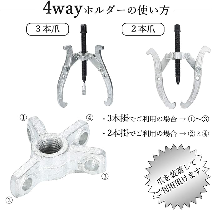 ✅ギヤやベアリング、プーリーなどの取外し工具となります。車両だけでなく、ドラム式洗濯槽やダクトなど特殊な引き抜き工具として重宝します。引き抜く対象の形状により内掛け・外掛けにも簡単に対応可能です。