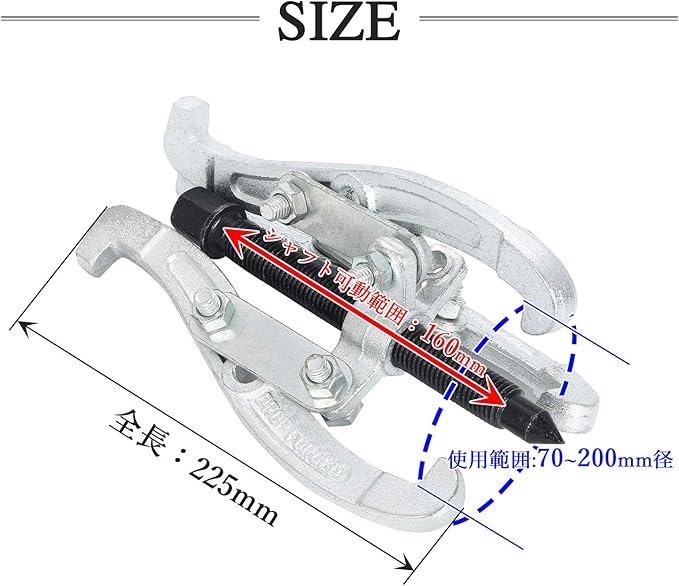ギヤやベアリング、プーリーなどの取外し工具となります。車両だけでなく、ドラム式洗濯槽やダクトなど特殊な引き抜き工具として重宝します。引き抜く対象の形状により内掛け・外掛けにも簡単に対応可能です。 【サイズ仕様】使用範囲:70-200mm シャフト可動範囲:160mm 全長:225mm 素材:高品質クローム鋼鍛造製 【商品内容】 ギアプーラー 8インチ 200mm 3本爪2本爪両用タイプ、オリジナルマイクロファイバータオル