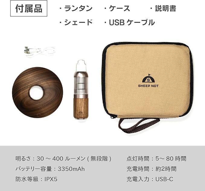 【神戸発ブランド】SheepNot KURUMI LIGHT ウォールナット 2WAY LEDランタン USB-C充電 400ルーメン IPX5防水 シェード付き (ランタンのみ)